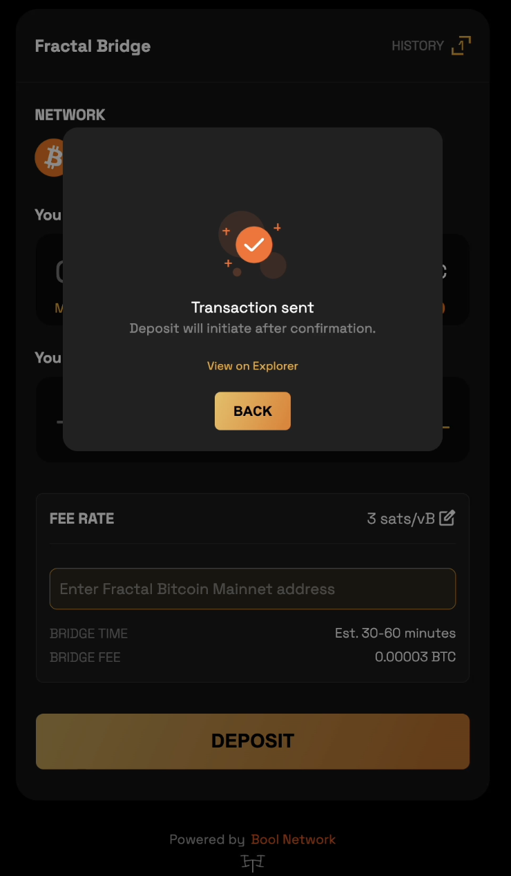 请注意,Fractal Bool Bridge 需要比特币上的四个确认区块才能在您的 Fractal 余额中显示。这是为了确保资产的安全性。通常,您需要等待 30-40 分钟才能在 Fractal 上收到您的 bBTC。