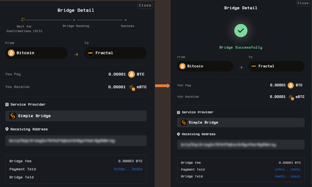 您可以随时访问桥接历史页面查看您的桥接存入和提现历史:https://fractal.unisat.io/bridge/history